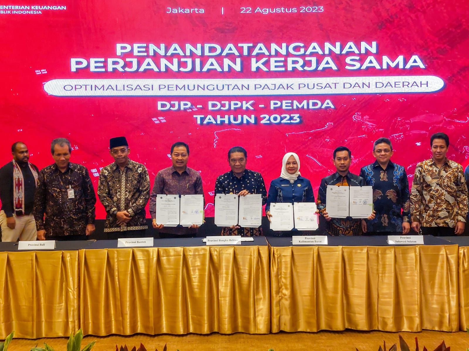 Hal itu diungkap Al Muktabar saat menyampaikan sambutan sebagai Wakil Pemerintah Daerah pada Penandatanganan Perjanjian Kerja sama Optimalisasi Pemungutan Pajak Pusat Dan Pajak Daerah antara DJK, DJPK, dan Pemda Tahap V di Aula Cakti Buddhi Bakti Gedung Mar’ie Muhammad Kantor Pusat Direktorat Jenderal Pajak Kementerian Keuangan Republik Indonesia, Jl Gatot Subroto Kav. 40-42 Jakarta, Selasa (22/8/2023).