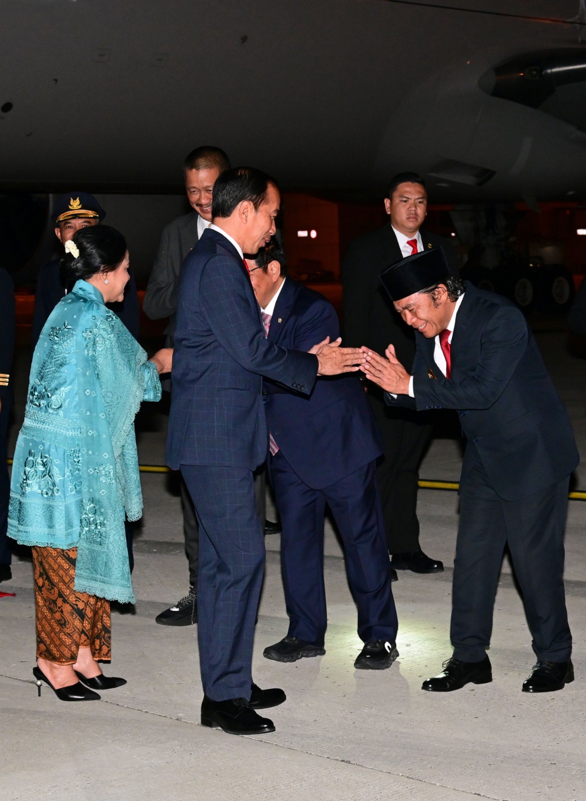 Di bawah tangga pesawat, selain Al Muktabar, tampak menyambut Presiden dan rombongan Sekretaris Kabinet Pramono Anung, Kepala Staf Umum TNI Letjen Bambang Ismawan, Dan Wakil Kepala Kepolisian Negara Komjen Agus Andrianto.