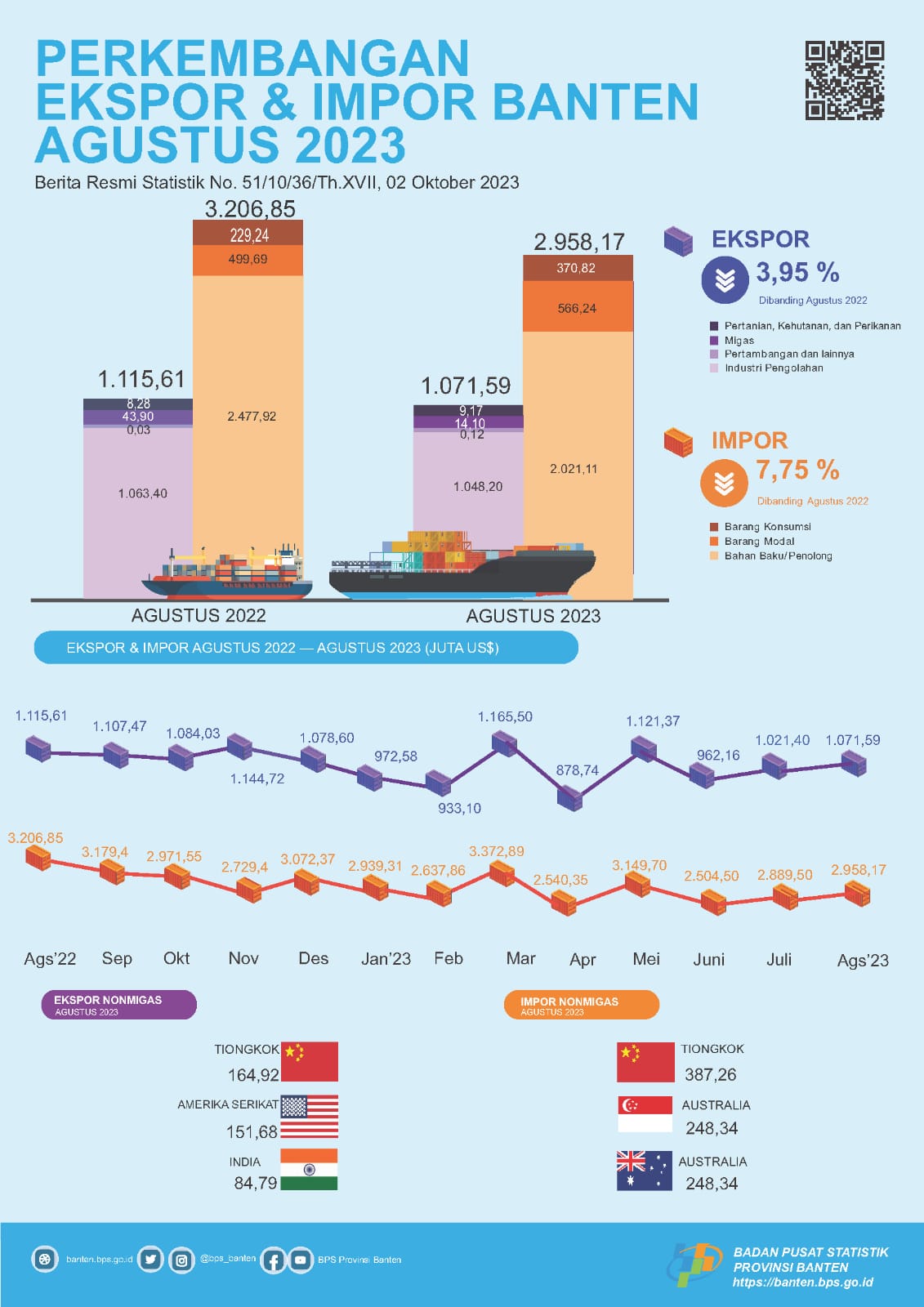 Perkembangan ekspor dan impor itu dikeluarkan oleh Badan Pusat Statistik (BPS) Provinsi Banten pada 02 Oktober 2023 melalui Berita Resmi Statistik No. 51/10/36/Th.XVII.