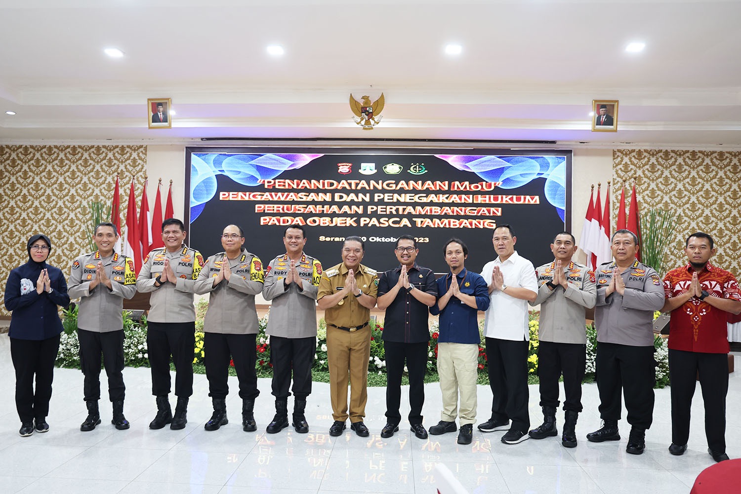 (Infoparlemen.co.id) – Penjabat (Pj) Gubernur Banten Al Muktabar tandatangani kesepakatan bersama dan pakta integritas penegakan hukum perusahaan pertambangan pada objek pasca tambang antar Kepala Kepolisian Daerah (Polda) Banten Irjen Pol Rudy Heriyanto Adi Nugroho, Kepala Kejaksaan Tinggi (Kajati) Banten Didik Farkhan Alisyahdi, serta Inspektur Pertambangan Kementerian ESDM Harry Nurdiansyah di Ruang Pertemuan Markas Kepolisian Daerah Banten, Jl Syech Nawawi Al Bantani, Banjarsari, Kota Serang, Jum’at (20/10/23).