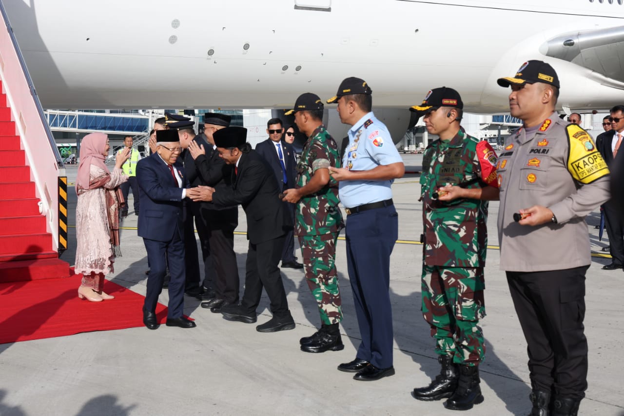 Tangerang, (infoparlemen.co.id) – Penjabat (Pj) Gubernur Banten Al Muktabar menyambut kedatangan Wakil Presiden Republik Indonesia KH Ma’ruf Amin beserta rombongan di Gedung VVIP Terminal 3 Bandara Soekarno-Hatta, Tangerang, Kamis (8/2/2024). Pesawat Kepresidenan Garuda Indonesia GA B777-300ER yang ditumpangi Wapres beserta rombongan mendarat pukul 7.30 WIB dari Kunjungan Kerja ke Abu Dhabi, Persatuan Emirat Arab, dan Arab Saudi.