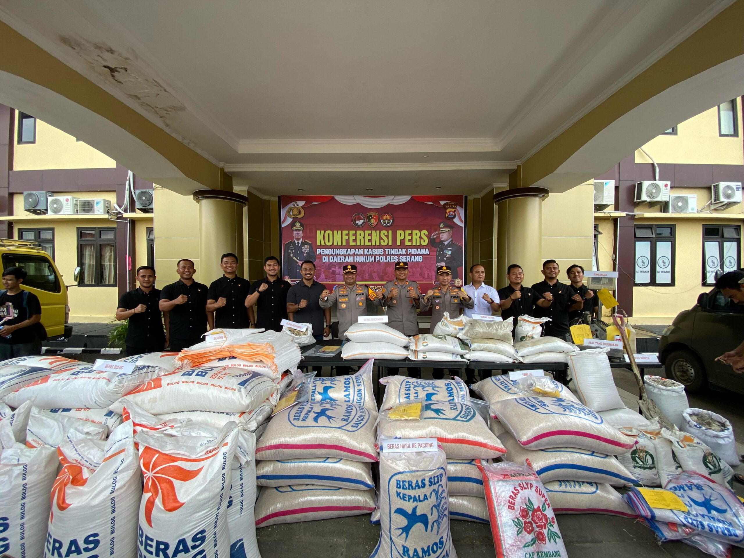 Kapolres menjelaskan terbongkarnya dugaan tindak pidana persaingan curang dan perlindungan konsumen dengan modus mengoplos dan repacking beras, setelah Tim Unit Tipidter dan Polsek Carenang melakukan penyelidikan terhadap huller yang juga gudang penyimpanan beras.