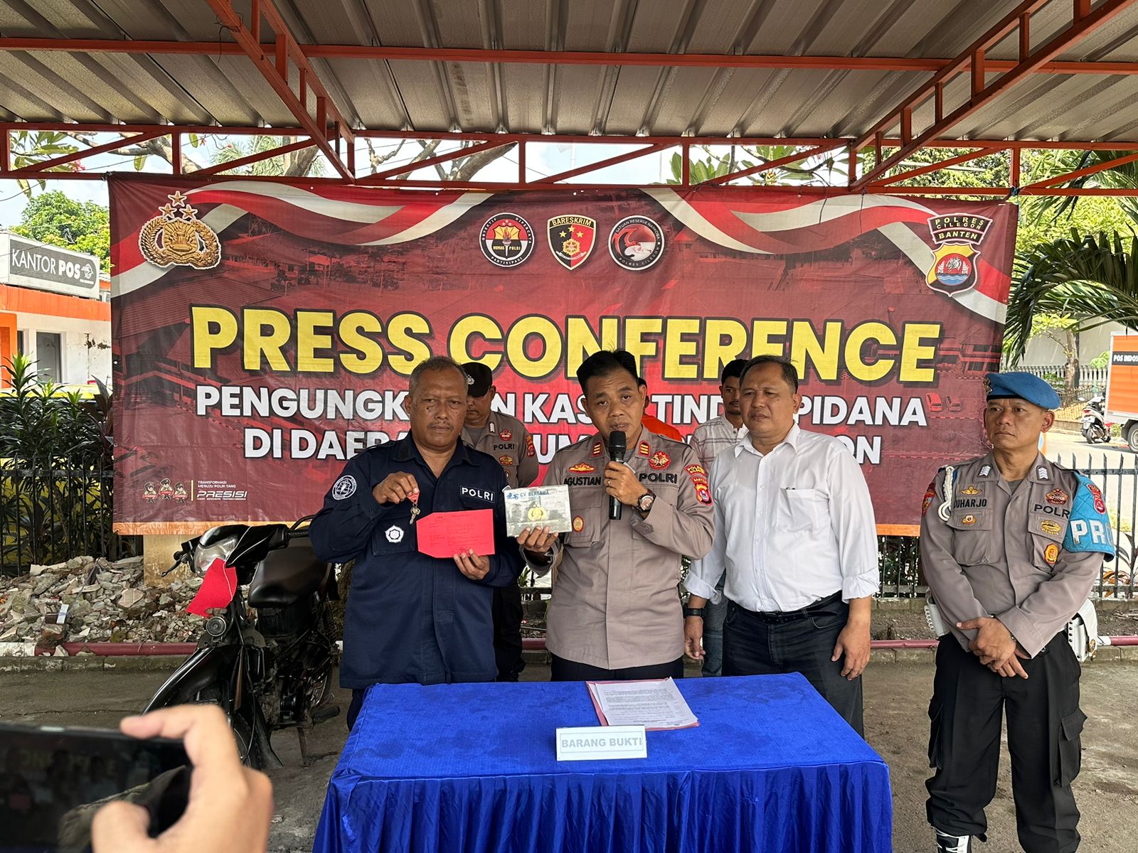 Kapolres Cilegon Polda Banten AKBP Eko Tjahyo Untoro melalui kapolsek Cilegon Polres Cilegon AKP Agustian pada saat press conference ungkap kasus tindak pidana Penggelapan 1 (Satu) Unit SPM Yamaha Vega ZR Nopol : A-5433-VP warna Hitam, yang terjadi Pada hari Rabu tanggal 03 April 2024 sekira jam 15.00 Wib di depan kontrakan tepatnya di Jln. Sadewa No. 168 Kav. Blok Kelurahan Bendungan Kecamatan Cilegon Kota Cilegon