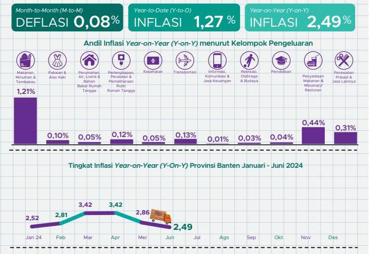 Pada bulan Juni 2024, terjadi deflasi month to month (m-to-m) Provinsi Banten bulan Juni 2024 sebesar 0,08 persen dan tingkat inflasi year to date (y-to-d) sebesar 1,27 persen dan inflasi (y-on-y) sebesar 2,49 persen.