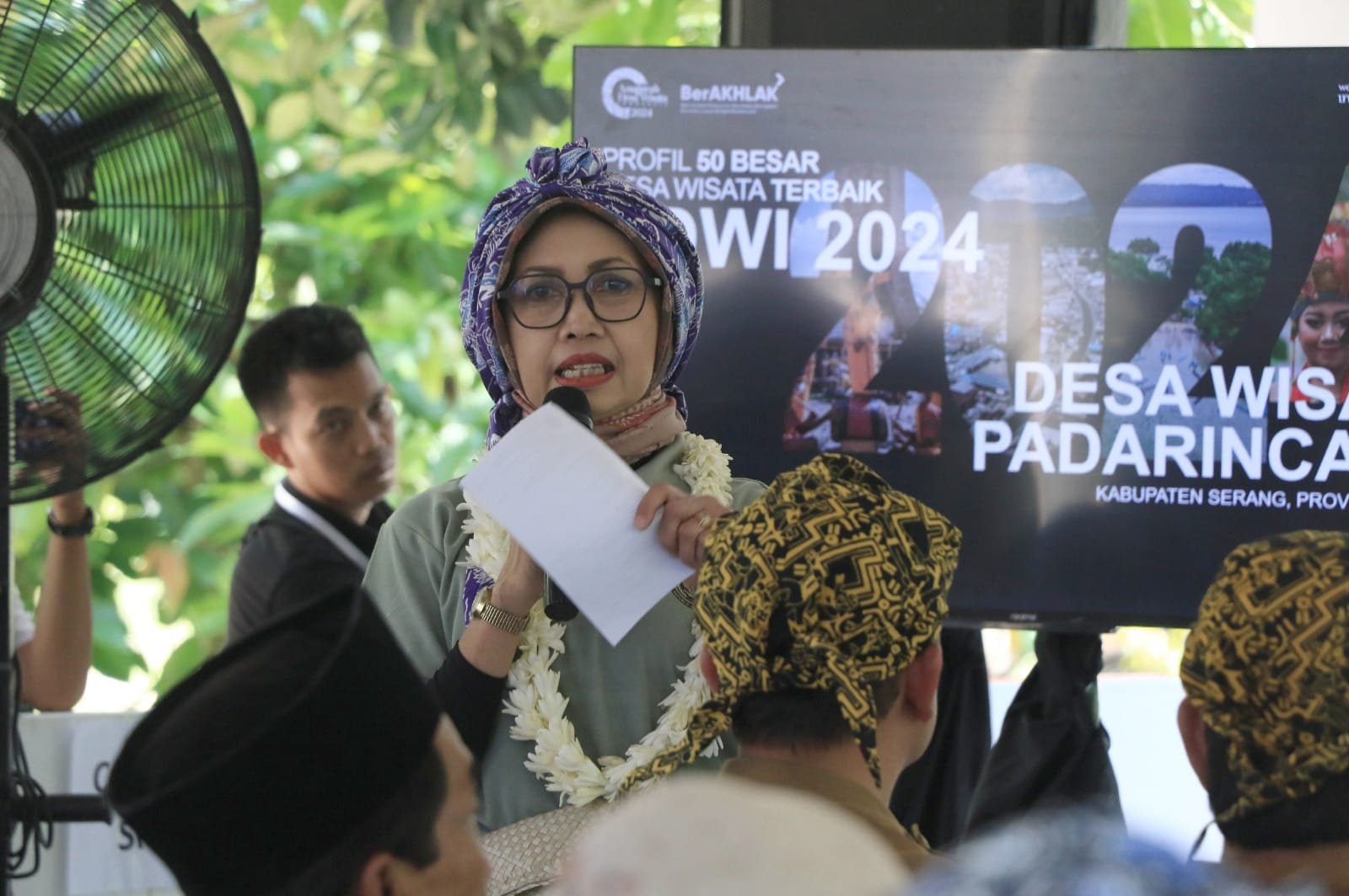 Direktur Insfrastruktur Ekonomis Kreatif Direktorat Insfrastruktur Ekonomis Kreatif Kemenparekraf RI, Oneng Setya Harini bersama Tim Dewan Juri ADWI 2024 Kemenparekraf, Ari S Suhandi dan Madeleina Sophie melakukan Visitasi dan Penilaian ADWI 2024 ke Wisata Kacida Cibuntu Desa Padarincang, Kecamatan Padarincang, Kabupaten Serang pada Selasa, 16 Juli 2024.