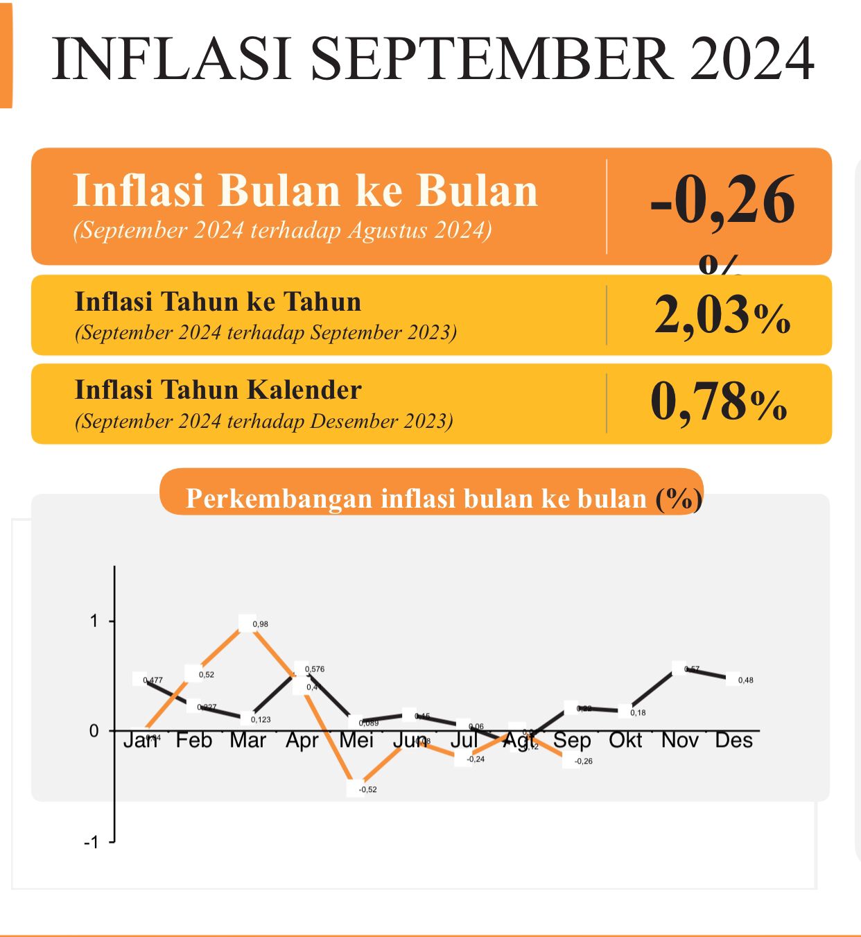 Untuk inflasi bulan ke bulan periode September 2024 – Agustus 2024 terjadi penurunan atau deflasi sebesar -0,26 persen. Sementara untuk inflasi tahun kalender September 2024 – Desember 2023 sebesar 0,78 persen.
