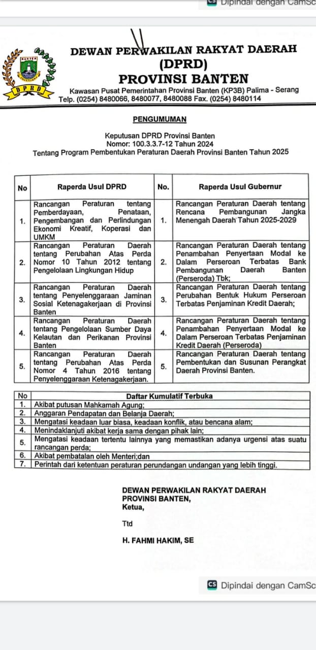 Serang, (Infoparlemen.co.id) – Dewan Perwakilan Rakyat Daerah (DPRD) Provinsi Banten secara resmi menetapkan Program Pembentukan Peraturan Daerah (Perda) Provinsi Banten Tahun 2025. Penetapan ini tertuang dalam Keputusan DPRD Provinsi Banten Nomor 100.3.3.7-12 Tahun 2024. Program ini mencakup sejumlah rancangan Perda strategis yang dirancang untuk mendukung pembangunan dan kesejahteraan masyarakat di Banten. (5/12/2024)