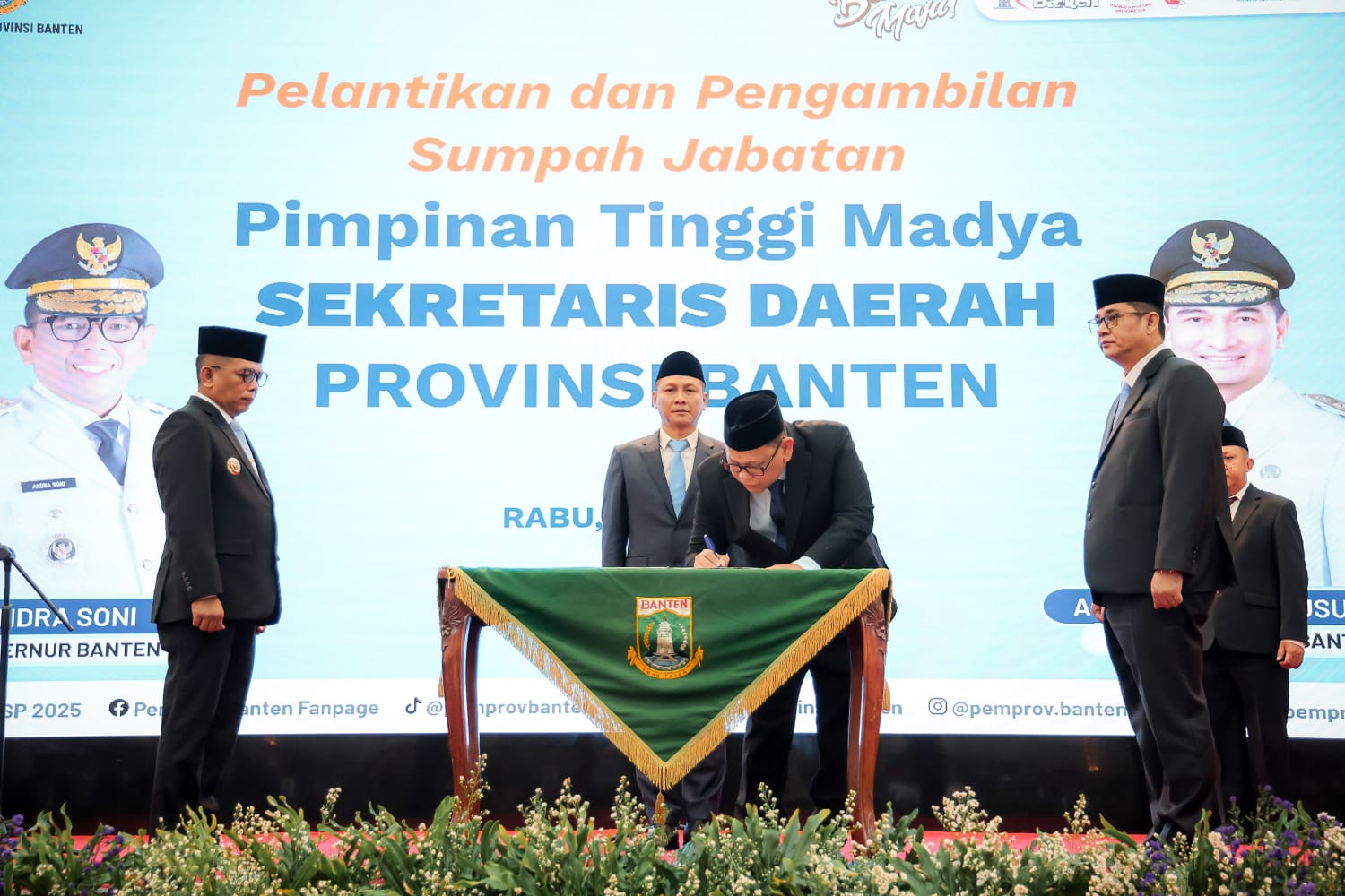 Serang, (infoparlemen.co.id) – Gubernur Banten Andra Soni secara resmi melantik Deden Apriandhi Hartawan sebagai Sekretaris Daerah (Sekda) Provinsi Banten. Acara ini bukan sekadar seremonial pelantikan, tapi juga momentum strategis untuk menegaskan pentingnya sinergi dalam menjalankan roda pemerintahan. Di Pendopo Gubernur Banten, KP3B, Kota Serang, Rabu (9/7/2025),